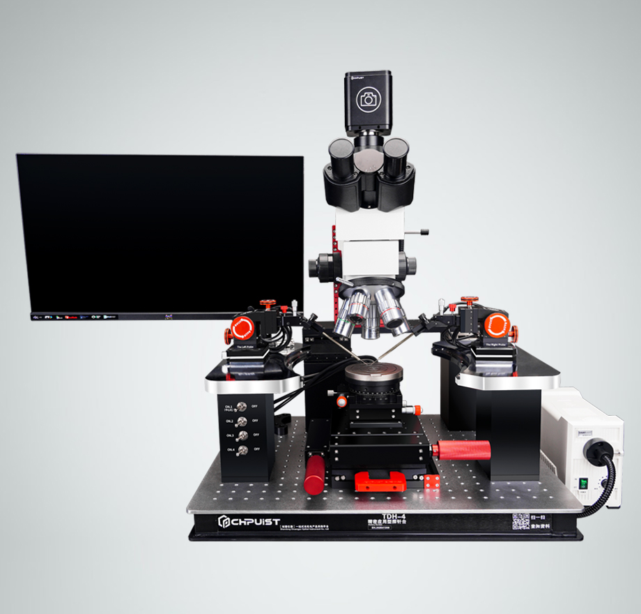 探针台(Prober station)又称探针测试台,主要用途是为半导体芯片的电参数测试提供一个测试平台,探针台可吸附多种规格芯片,并提供多个可调测试针以及探针座,配合测量仪器可完成集成电路的电压、电流、电阻以及电容电压特性曲线等参数检测;